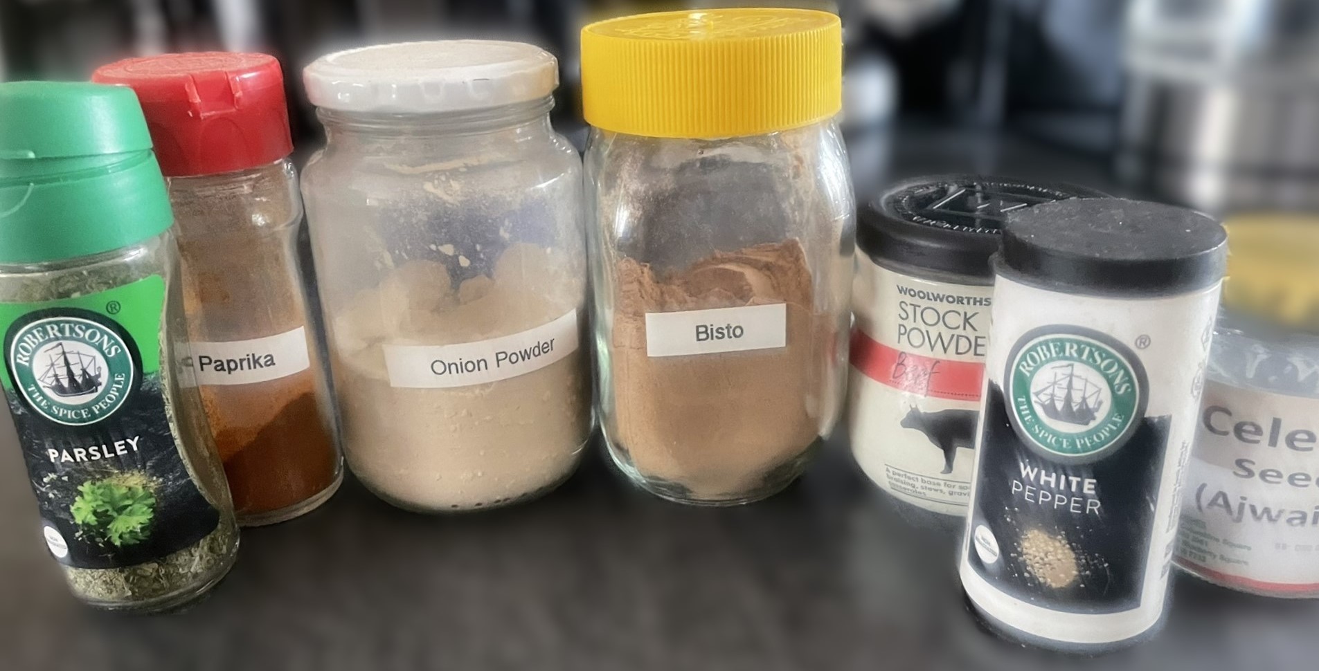 Onion powder – I've purchased a hard-to-find ingredient at both Woolworths and West Rand Plastic. The issue is that it solidifies in the bottle; however, I manage by chopping it out and grinding it back into powder, which proves effective.